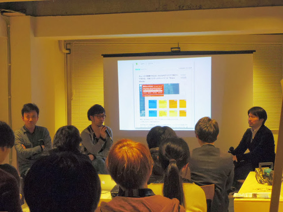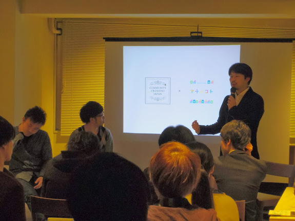(会場の皆さんお待ちかね、「マチノコト」ライターの江口晋太朗さん・モリジュンヤさんより「ヒトとコミュニティ」についてのプレゼンテーション)