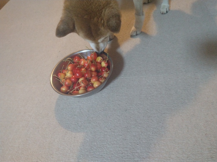 仕事から帰ると相変わらず抱っこしてモードです。不安だったのか、どこか痛みがあるのか、普通に甘えているだけなのか…よくわからないまま抱っこです。慣れたとはいえ60代の腕には長時間の8Kgはしんどいので、今日は🍒で気を散らせてあげました。