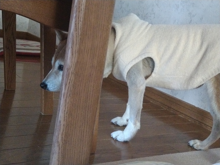 テーブルの下に隠れ…でも気になるし…みたいな体勢を最近よくしています。加齢によるものかとも思っていましたが、退院後特に酷くなりました。サバンナのハイエナが獲物に近付く時のようなスタイルで肩もこりこりです。まだまだあんずを理解出来ない部分はありますが一緒に病気と闘っていきます!!
