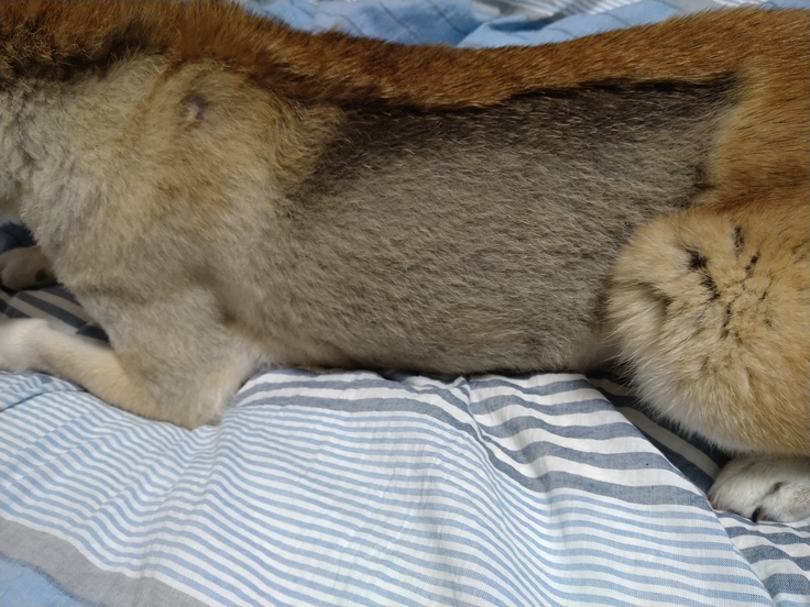 今日抱っこをした時久しぶりに抱き心地が良く感じられ、そう言えば術後5週目になりピンク色の皮膚だった部分も少しずつ毛が伸びてきております。傷跡も随分隠れて見えなくなりました。