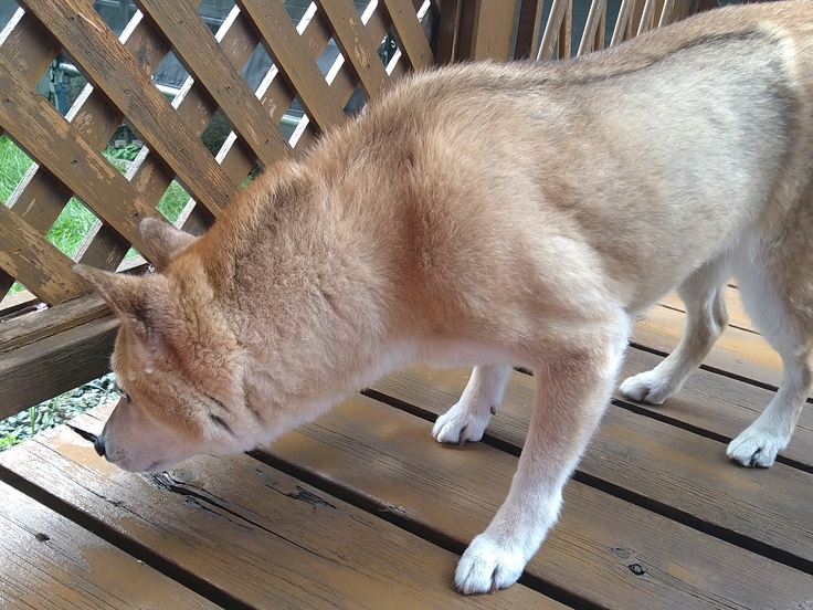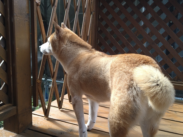 「お外は暑いよ」と言っても気が済まなかったようですので、ウッドデッキまで出してあげました。
