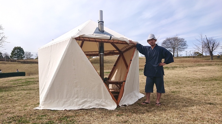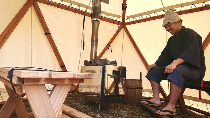 ためしに、既成の野外サウナセットで、デモンストレーションを行ってみたところ、好評だったため、本格的にオリジナルのサウナテントセットの開発に乗り出そうと思いました。