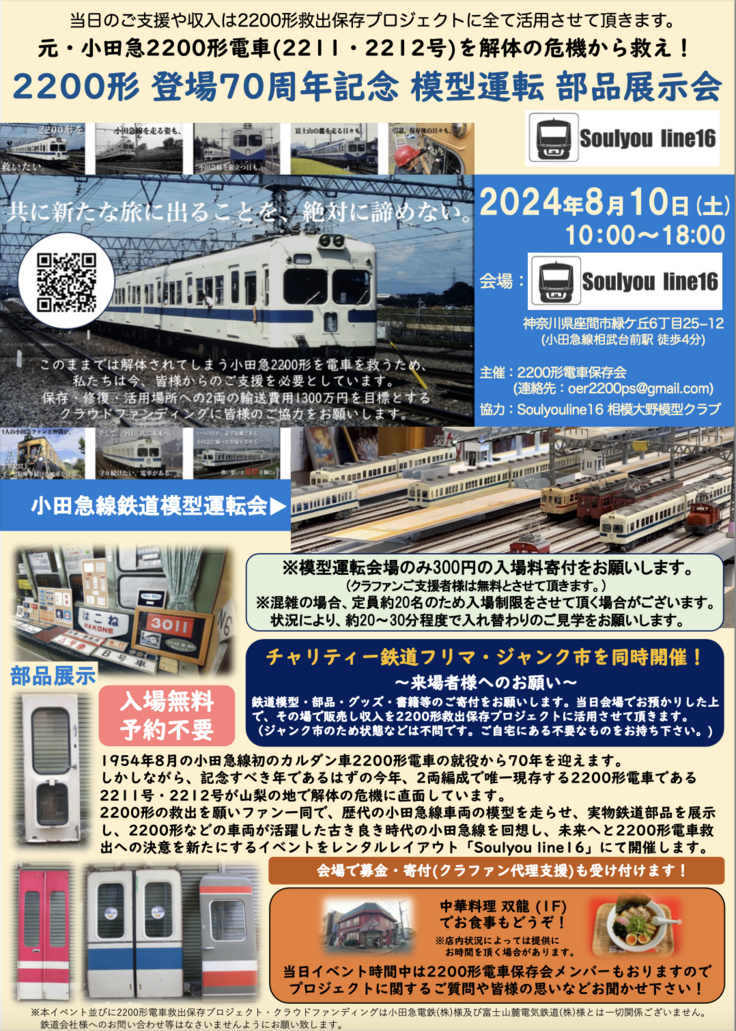 時は流れ今解体の危機にある2211.2212号を救うべくクラウドファンディングを開催中ですが、支援イベントとして「2200形登場70周年記念 小田急模型運転・部品展示会 in Soulyoulinne16」を開催いたします。