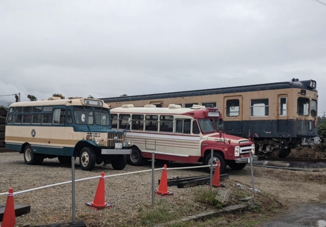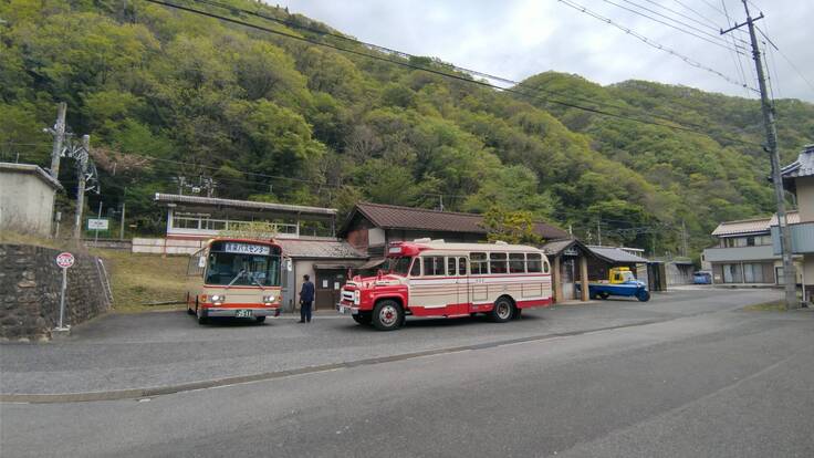 なおこの赤いボンネットバス(昭和39年式の「ニッサンU690型」)は、元は岡山県の備中高梁駅近くで営業を行う備北バスの路線バスとして使用されており、昭和50年代に風前の灯だった全国のボンネットバスがほとんどいすゞ製だった中で、ニッサン製のこのバスは希少な存在でした。