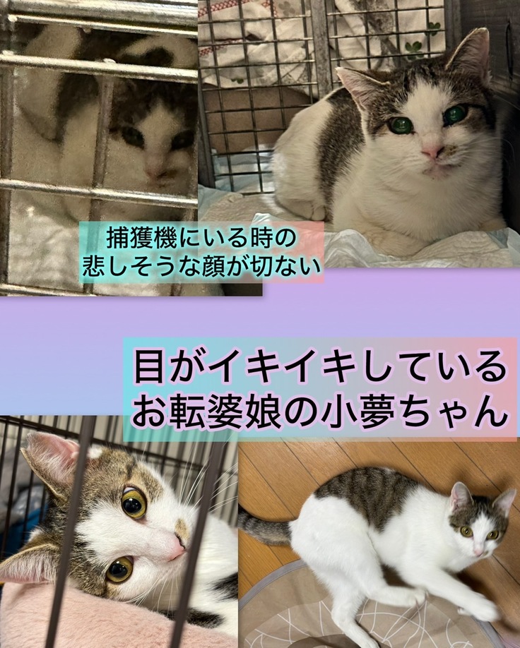 そんな中、シェルターの大人猫が里親さんと巡り合い、譲渡され、シェルターの三段ケージが一つ空きました。運良くその時に、リターン予定で捕獲器に入っていた、推定生後9ヶ月の「小夢ちゃん」がシェルターに入る事ができました。