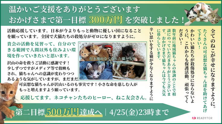 ネクストゴールは500万円です。追加でご支援いただいた金額は、継続して猫たちの医療費・療養費に充てさせていただきます。