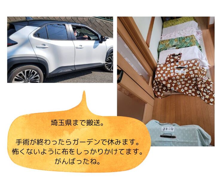 避妊・去勢手術のために、埼玉にある協力病院、いながき動物病院まで搬送します。