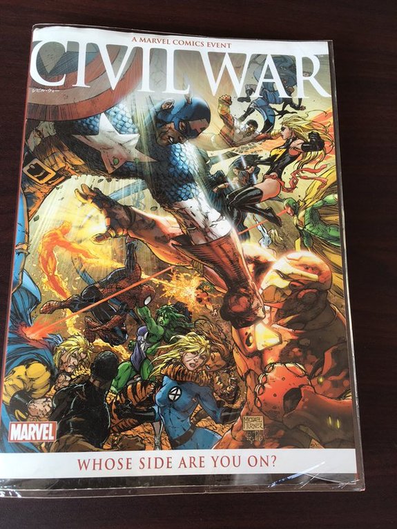 キャプテンアメリカの映画の次回作のタイトルにもなってます。ヒーロー同士の「内戦」という衝撃的な事件が描かれます。ヒーローは政府の管理下に入るべきなのか?