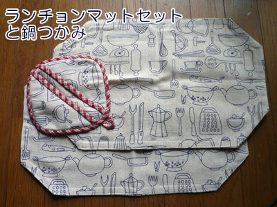 ・この活動を応援してくださっている被災地の方の手作りランチョンマット・ペアと鍋つかみのセットとバック