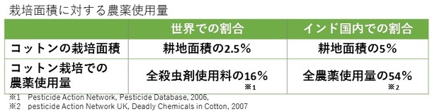 コットンの栽培には大量の農薬が使われます。特にインドでは、他の作物を含む国内耕地面積のわずか5%でコットンが栽培されていますが、コットン栽培に使う農薬はすべての作物に使われる量の54%を占めます。