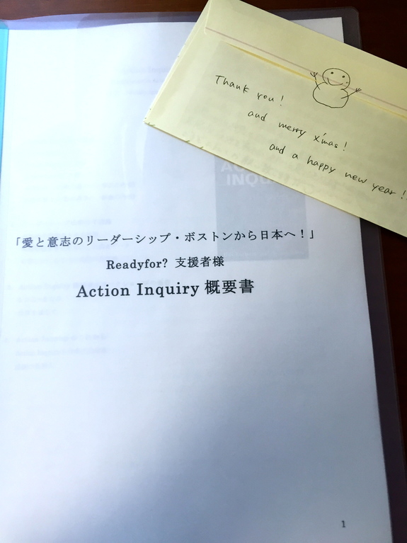 お力を貸して下さった皆様に、少しでもプラスになるような情報がこの書類の中にあるようにと、心から願っております。そんな気持ちを、封筒の中へ込めさせて頂きました。こうしてAction Inquiryの概要書をまとめる過程でも、自分自身の理解もまた一段階深くなり、このセオリーに感じる可能性もまたひとつ大きくなりました。そんなわくわく感も、文字から伝わって頂ければ嬉しいなと、密かに願っております。