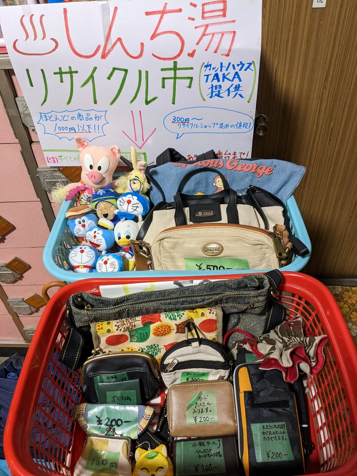 女湯には「しんち湯リサイクル市」もあります!いいものが安価で手に入るスペースです。お子様にはぬいぐるみや乳児の靴、カバンや財布などあります。