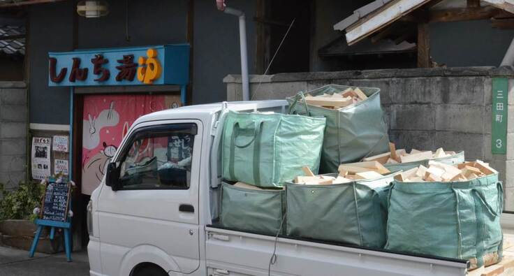 しんち湯は薪で焚いている銭湯になります。いつもは父が薪を集めに行っています。いつも軽トラいっぱいに積んで帰ってきます!それでも3日持つかどうかの量にはなります。