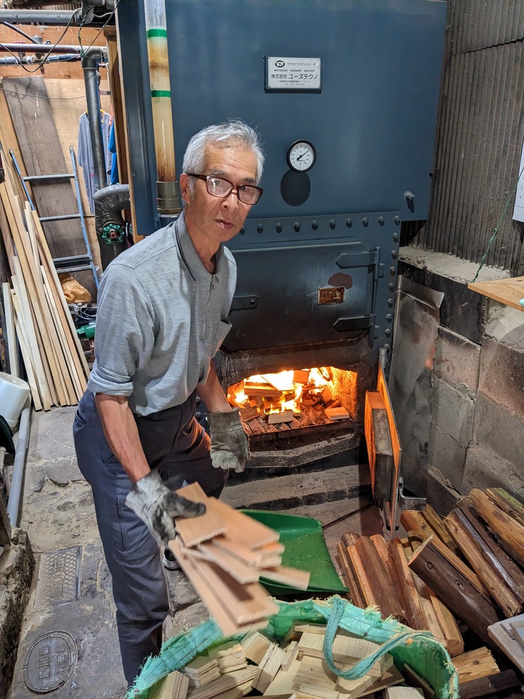 釜場は毎朝10時すぎから焚き始めます。主には父が焚きますが、父も他の仕事も兼ねてますので、その時は母と私が交代交代で行っております。