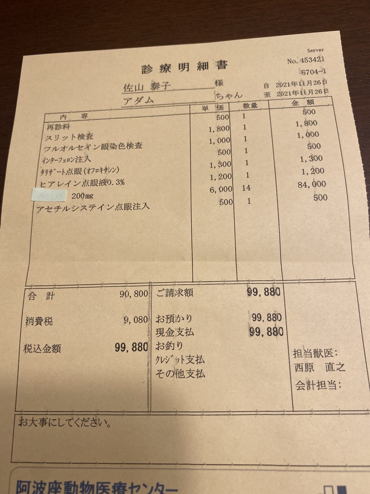 新薬の治療費は体重と病状で決まります。投薬開始時2.9kgのアダムはウエットタイプ進行も早く始めては腹水もかなりあり神経症状も少し出てたので3錠服用の予定でした。