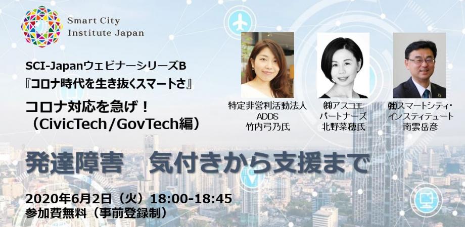 さて、このこの度は、Smart City Institute Japan ウェビナーシリーズ『コロナ時代を生き抜くスマートさ』コロナ対策を急げ!発達障害 気付きから支援までにおきまして、弊法人共同代表の竹内が「オンライン支援の可能性やデータサイエンスに基づく発達支援」につきまして、弊法人の取り組みと展望をお話しさせていただきます。
