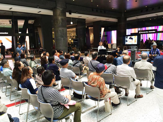 多くの方が行き交う広場に会場を構え、減らせ突然死プロジェクトのパネル&映像展示、青木まり子さんがAED普及テーマソング「君の瞳」を含むミニライブ、ハートソシオメンバーによる心肺蘇生講習と盛りだくさんの内容でした。