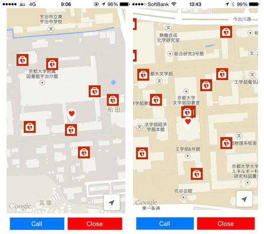 開発中のアプリに京都大学宇治キャンパス内のAEDをマッピングし、アプリでSOSの受発信のテストを実施しました。