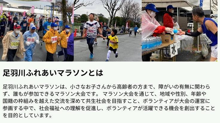 現在の足羽川ふれあいマラソンの前身は、30年前に地域の方たちが自主的に立ち上げたものでした。しかし、運営団体の高齢化により継続が困難となったため、2013(平成25)年から足羽福祉会が大会運営を引き継ぐこととなりました。私たちはマラソン大会を通じて、地域や性別、年齢や国籍の枠組みを越えた交流を深めて共生社会を目指すこと。ボランティアが大会の運営に参画する中で、社会福祉への理解を促進し、ボランティアが活躍できる機会を創出することを目的としています。