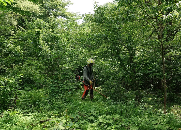 下刈りとは、植栽した苗木の成長の妨げになる雑草木を除去する作業です。植栽木の成長を助け、つるがらみによる形質劣化を防ぐためにおこないます。