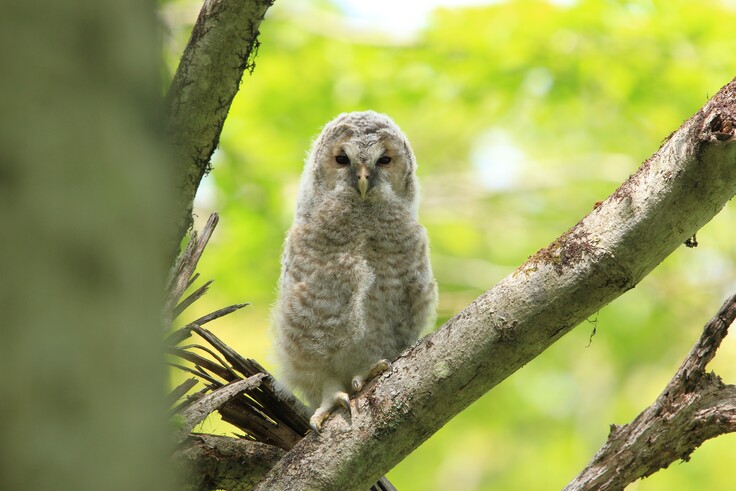 巣立ちを迎えたヒナは2週間ほど近くの木にとどまり、飛ぶ練習を繰り返す。そのいかめしい顔つきとふわふわの愛らしい姿は、私たちの目を楽しませてくれる。