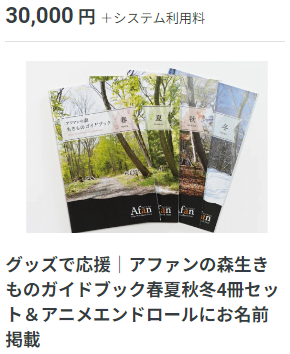 ▶︎<30,000円のコース>グッズで応援アファンの森生きものガイドブック春夏秋冬4冊セット&アニメエンドロールにお名前掲載をご支援したい方は、下記の画像をクリックすることで、該当のリターンの支援に移動します。