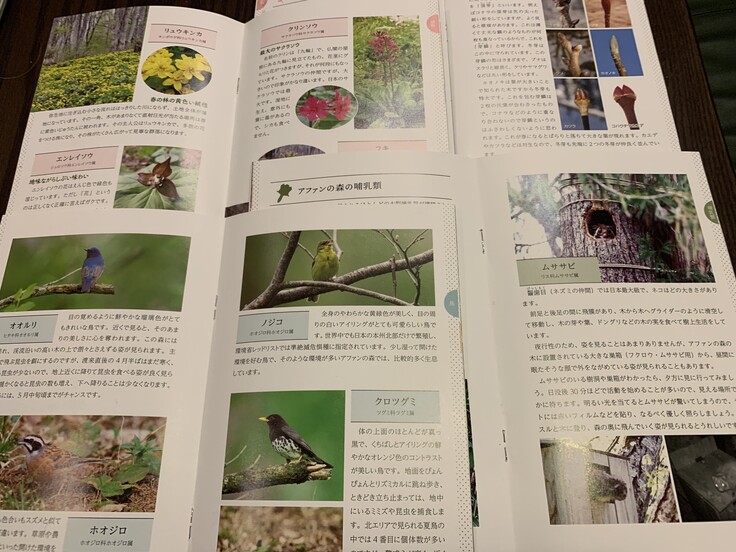 季節ごとにアファンの森でみられる特徴的な動植物35種づつ(28ページ)簡潔にわかりやすく紹介しています。ポケットに入るサイズのこのガイドブックを片手に森を歩けば、それぞれの生きもの達からのメッセージが聞こえてくるでしょう。