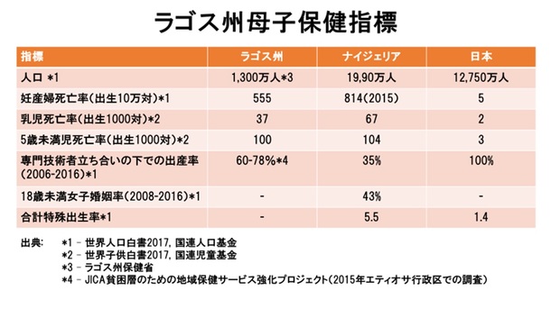 下の表はラゴス州、ナイジェリア国全体、日本におけるいくつかの母子保健指標を比べるためにつくりました。