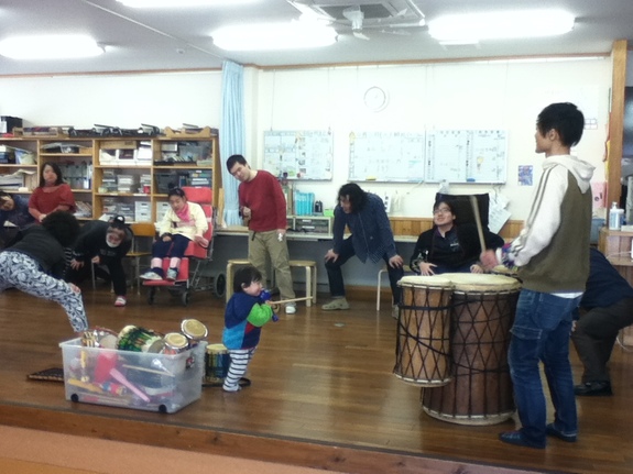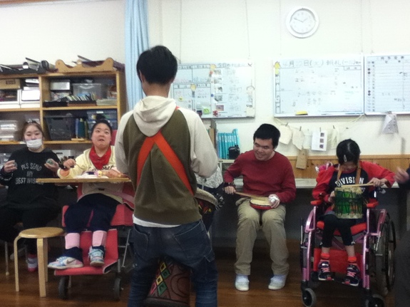 みんな太鼓や音の出る楽器を持って自由に音楽に合わせて演奏しています。