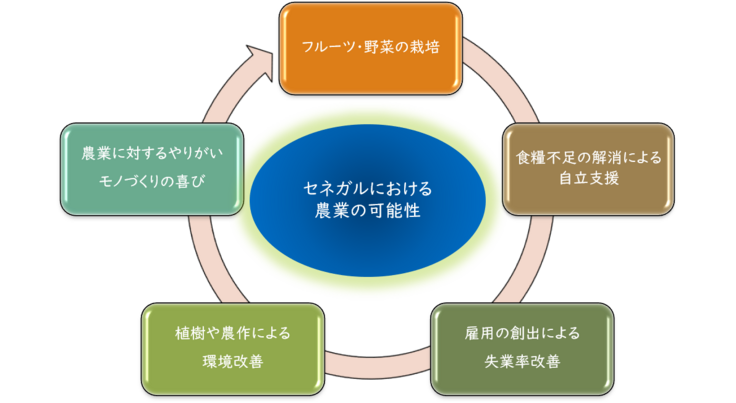 そこで、新しい品種を取り入れ、いろいろなフルーツや野菜を栽培可能にすることで、食糧不足の解消、そこに住む人々のやりがいに繋がる雇用創出、および失業率改善、『セネガルにおける農業の可能性』を通じて、より豊かな社会を目指していきたいと考えています。
