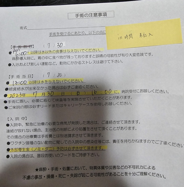 手術当日は朝の6時までにお薬とご飯をあげておくこと。