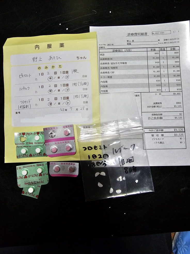 今日はどういって良いのか分からないですが、元気がなかったんで今日は利尿剤の注射は止めて貰う様にしていたんですが、手術まであと5日で、その間に肺水腫になっても困るから、お薬は減らせないのは分かっていて、注射は3/1の量で打って貰いました。