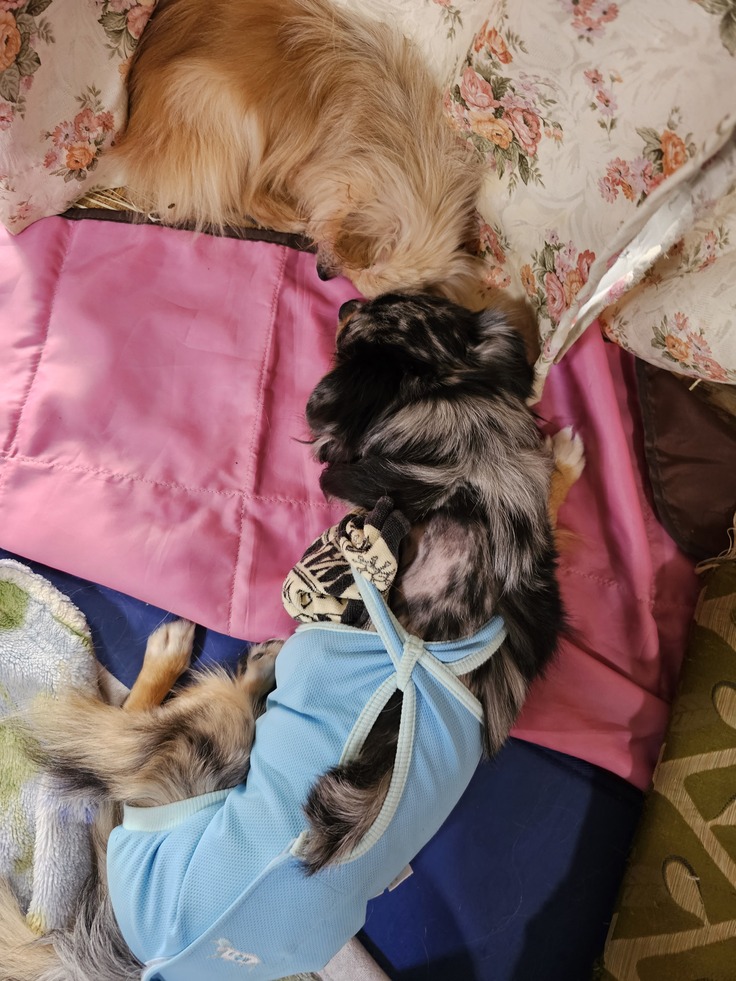 血管を縛る手術を、してからは仰向けで寝れる様になり、背中を敷物に擦り付けたり、そのまま寝たりと可愛い姿を見せてくれてます。