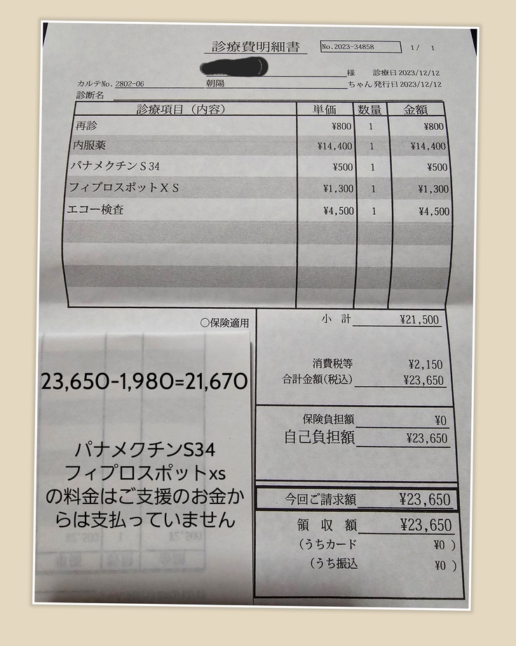 今年最後のフィラリアのお薬とノミダニのお薬はご支援して下さったご支援からはお支払いしていません。