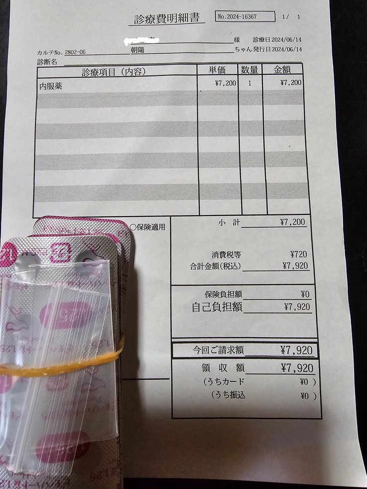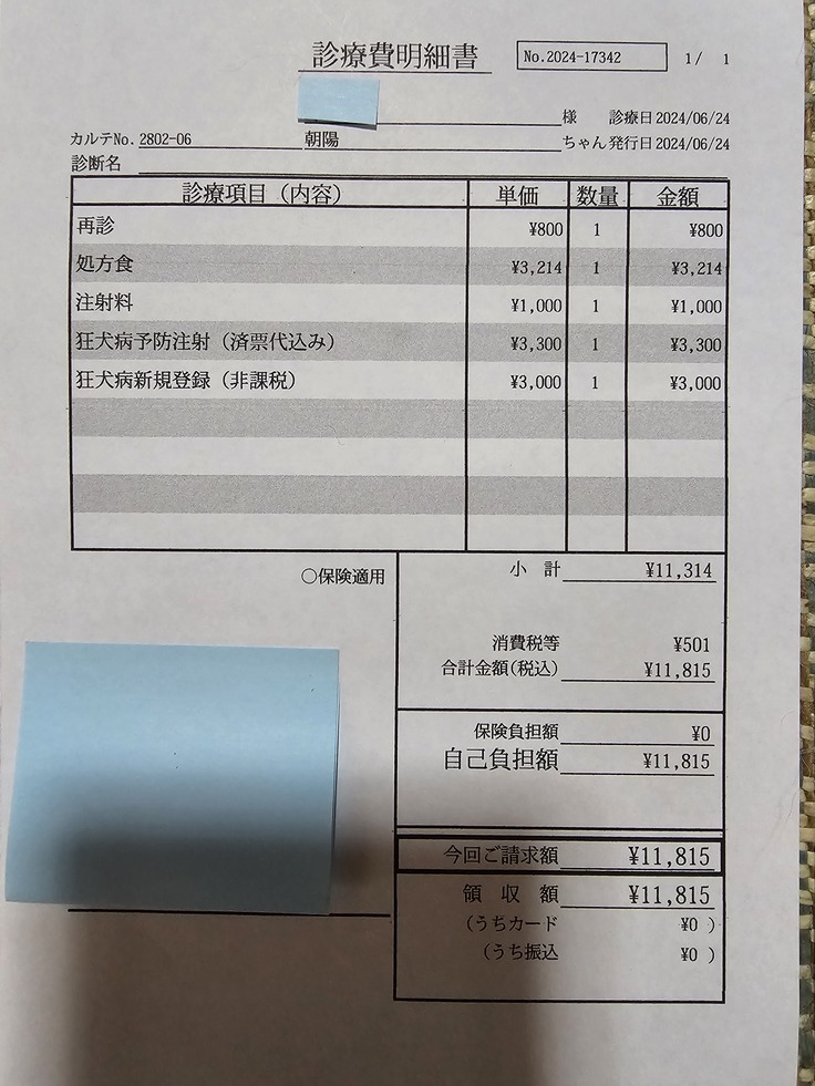 領収書はご飯と抗ヒスタミンの注射、狂犬病となっておりますが、クラウドファンディングでのご支援からは再診料と療養食のみお支払させて頂きました。