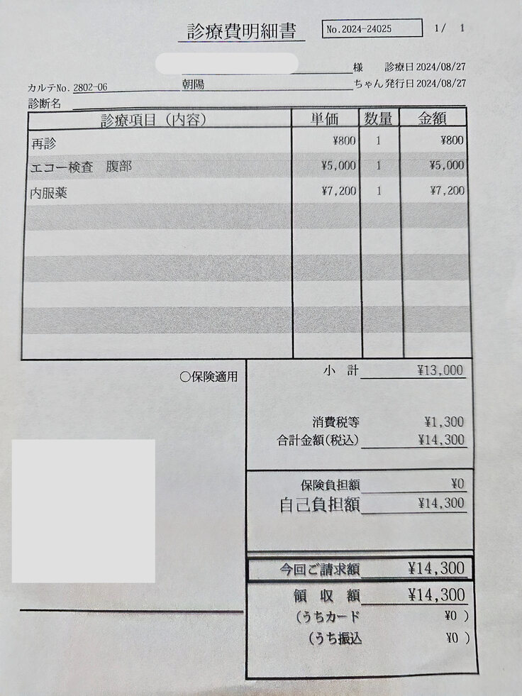 爪が物凄く尖って痛かったので切って爪先を丸くしていただきましたが、こちらの領収書には金額は入っていません。