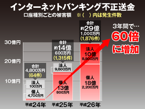 警視庁の調べによれば、平成26年のインターネットバンキング不正送金被害は、史上最悪の約29億1,000万円(被害件数約1,876件)に達しています。詐欺の手口も年々巧妙さを増してきており、以前は犯人が盗み取ったID・パスワードを手で入力して不正送金していたものが、今ではパスワードの盗み取りから不正送金までを自動化するシステムが使われています。その結果、これまで有効な防衛手段とされてきた電子証明書やワンタイムパスワードまでもが破られ被害に遭うようになってきました。