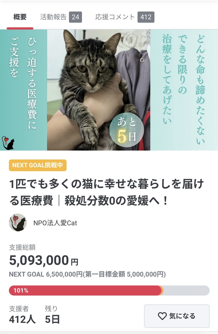 【ネクストゴールについて】 クラウドファンディングの残り期間は少ないですが、猫達のよりよい住環境のためにシェルターで使う空気清浄機1台、そして500万円満額を猫達のために使わせていただけるようクラウドファンディング手数料分を上乗せし、ネクストゴール650万円として設定させていただきたいと思います。
