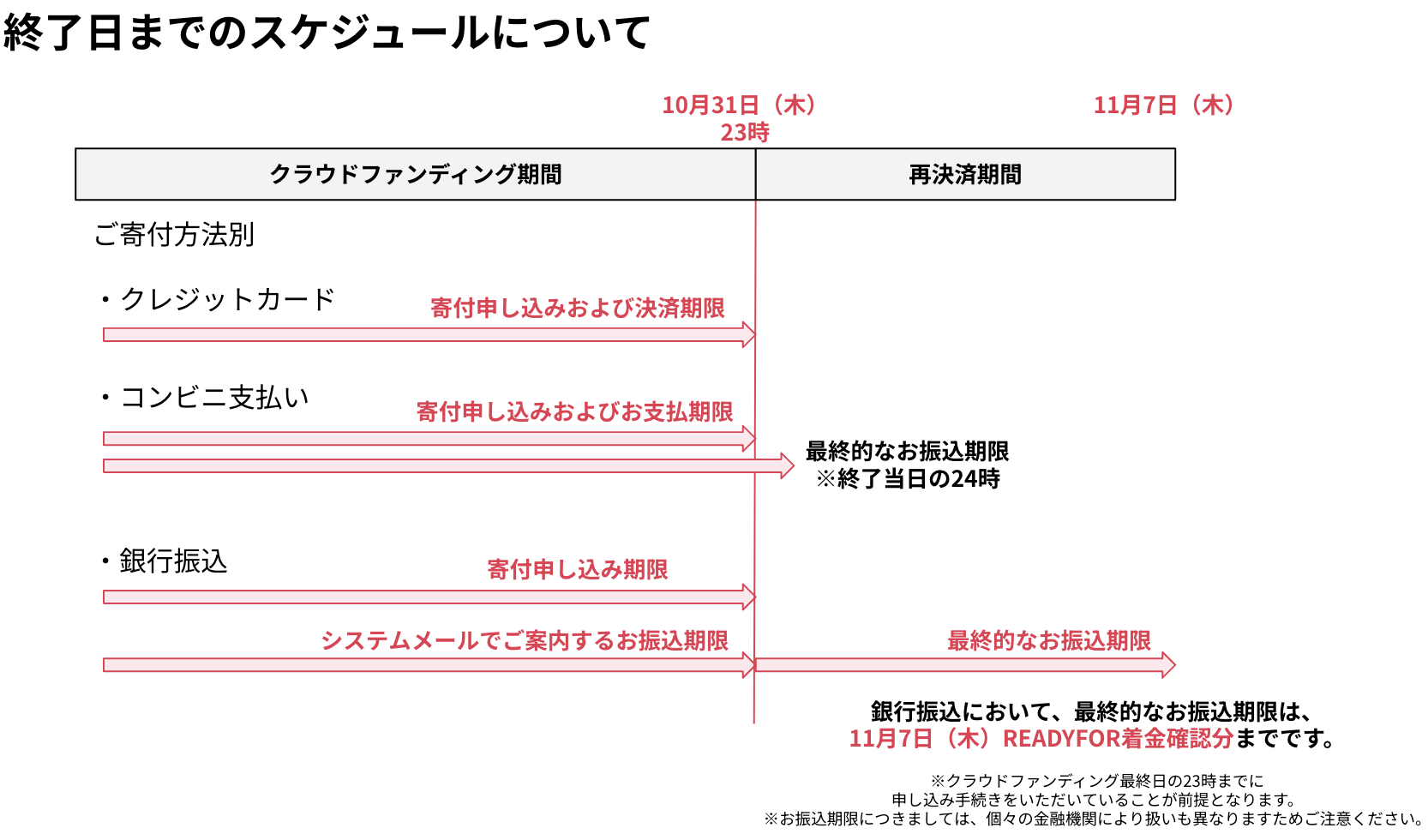 ご寄付方法別のスケジュールの詳細につきましては、下図をご参照の上、お間違いのないよう、よろしくお願いいたします。