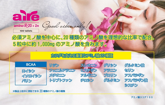 「世の中を明るく元気にする」をコンセプトにして、ブランド「aire(アイリ)」の企画をスタート、初となる今回のプロジェクトは、総合アミノ酸サプリメント「AminoR-20+Zn(亜鉛)」を販売します。