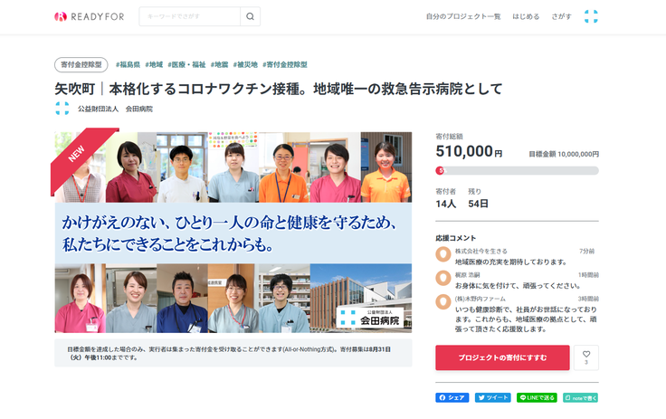 クラウドファンディングの受付が開始されて1日半経過致しましたが、既に多くの温かい支援と応援コメントをいただき、本当にありがたいと感じております。地域になくてはならない病院として頑張りますので、引き続きご指導の程よろしくお願い致します。