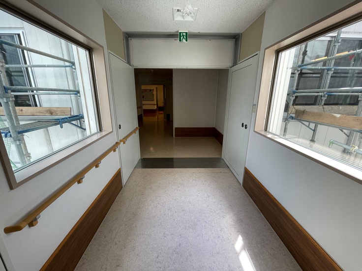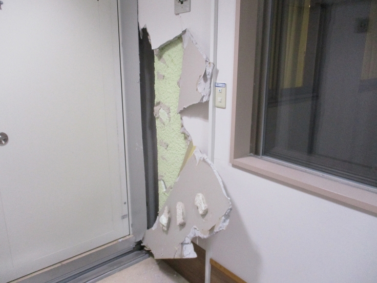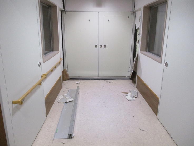当院は3つの建物から成り立っており、今回は建物同士を繋ぐ部分の工事状況をお伝えします。外来から病棟までが建物のつなぎ目を経由しないと行き来が難しい構造なので、往来する際の重要な役割となっています。地震発生時と現在で見比べて頂ければと思います。