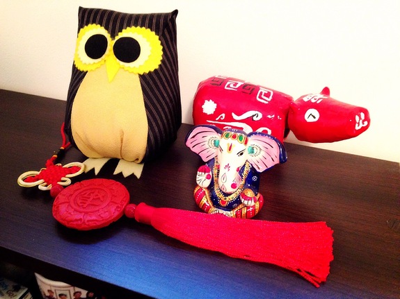 ばあちゃんが作ってくれたフクロウの周りに、中国の友達から貰ったお守り、福島で交流した時に一緒に絵付けした赤べこ、そして今年の夏にインドへ行ってホストマザーから貰ったガネーシャ(象の神様)の置物。日中印が勢揃い!