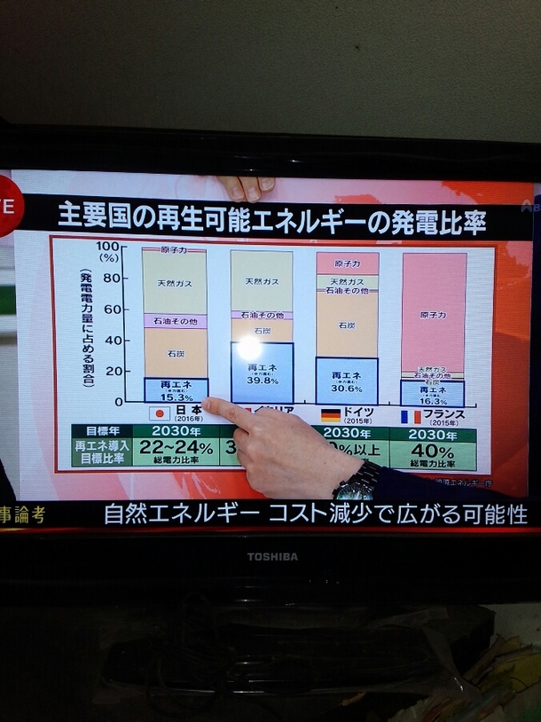 世界的に見ても再生可能エネルギーの発電比率を見ても 主要国と比べると日本はあまりにも低すぎる。イタリアは約40%もある。日本は、15.3%である。しかも目標も低い。化石燃料の比率が高すぎるのも何とかしたいと思います。
