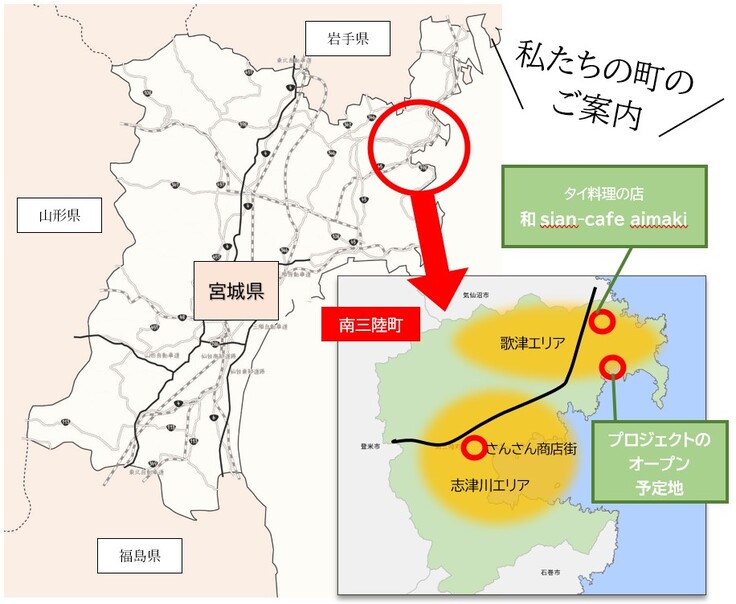 三陸自動車道が整備され、仙台から90分で来ることができるようになりました。 町外の人に「南三陸町」というと、「さんさん商店街ね」と言われますが、今回のプロジェクトの場所は、町の少し北の気仙沼に近いエリアです。 合併前は「歌津町(うたつちょう)」という町でした。