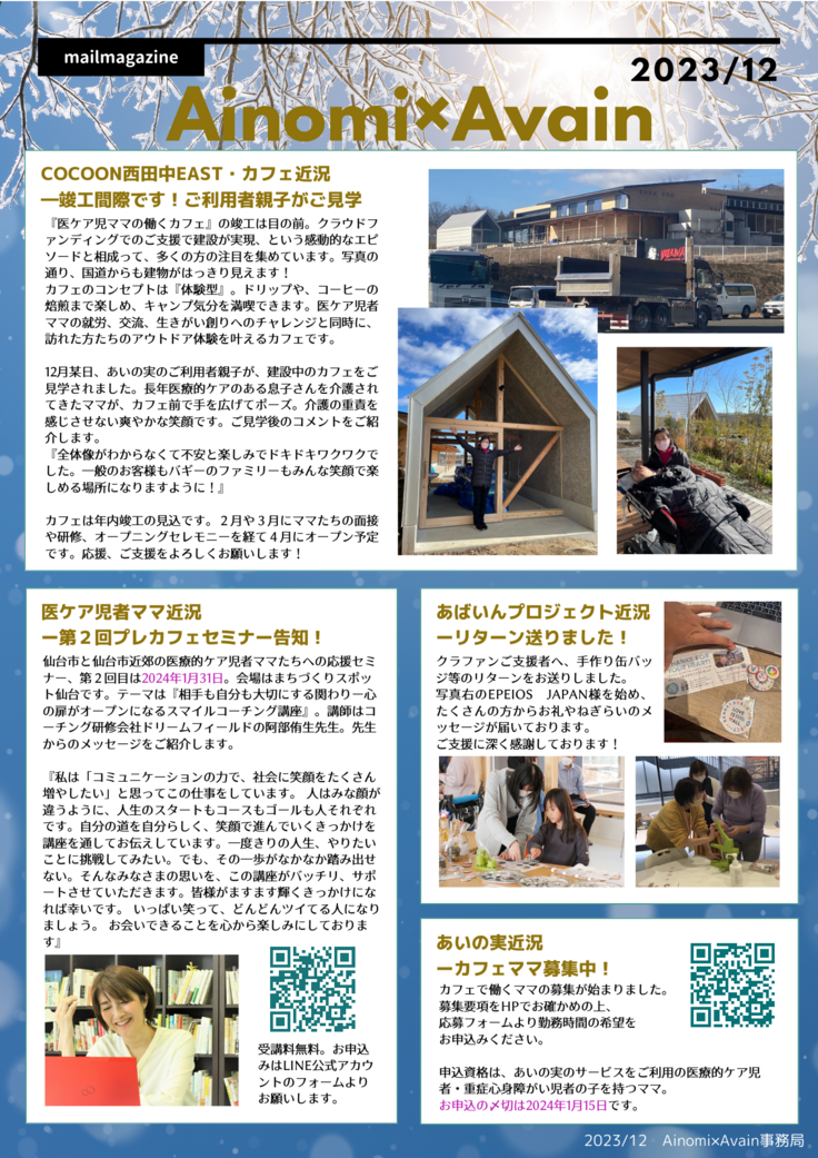1月メルマガでは『体験型カフェって!』『(続)あいの実クリニック取材』などをご報告予定です。引き続きご愛読下さい!(2023/12/30)