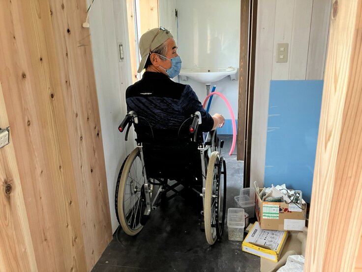 8割できていたものを、壊して、作り直し、、、幅広い安全なスロープを作り、義母が使っていた車いすを持ち込み 自分でも、サイズを確認 、 設計士の小川真樹先生にも質問をぶつける。