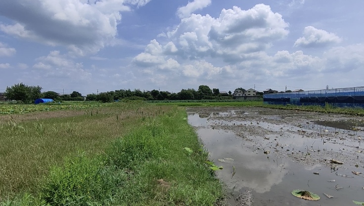 今回挑戦するのは、現在のブルーベリー狩り農園のすぐ隣にある、合計2反強の2枚の田んぼを再生すること。この場所は、蓮の栽培が行われていましたが連作障害で契約が終了した田んぼと、耕作放棄地となっていた田んぼです。