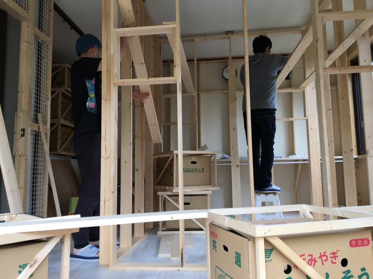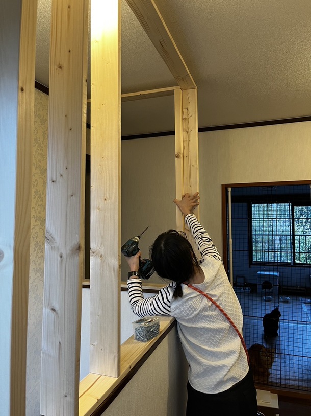 現在は、フリーの子たちのために階段からの転落防止+窓の外を眺められるようにキャットステップ、キャットウォーク、柵を作成中です。