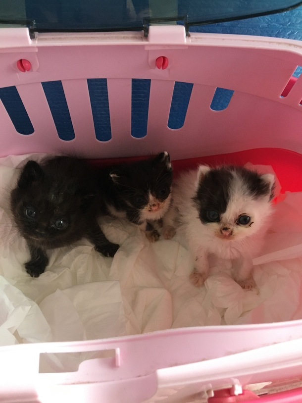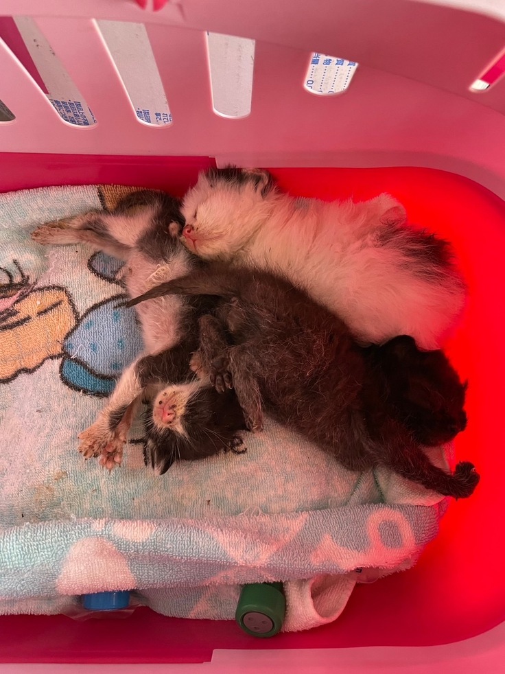 この子たちは、仙台市内の公園で雨の日にダンボールに入れられ、捨てられていたところを発見され、私に連絡が入りました。その頃生後1ヶ月も経っていない状態で、体は冷え切って低体温症になっている状態でした。すぐに体を温めて、ボランティア3人で協力して3時間ごとにミルクをあげて、なんとか「だいふく」と「そら」の2人は命を落とさずにすみました。でも、一緒に捨てられていた兄弟と思われる黒い子猫は一度は元気になったと思ったのですが、残念ながら亡くなってしまいました。